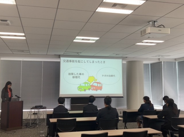 当日は、社長挨拶後、自動車保険の仕組みや会社の組織と役割について説明し、当社所属のパラアスリートである熊谷選手のデスク見学を行いました。また、電話応対体験を通じて、お客さまに心地よく感じていただける対応について一緒に考えました。