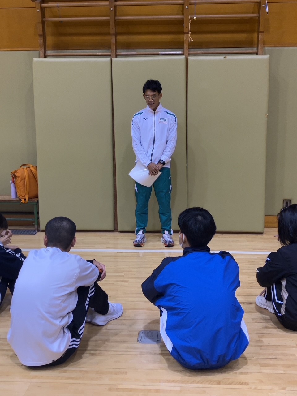 講座では、走るための基本的な身体作りと技術向上を目指し、臀部の強化を目的としたハーフスクワットや地面の反発を感じるためのジャンピング動作、足上げ運動などを一通り実施。その後、体育館内を走る実践的なトレーニングも行い、熊谷選手が参加生徒一人ひとりのフォームを丁寧にチェックしながら、姿勢や動作の改善点についてアドバイスを行いました。
